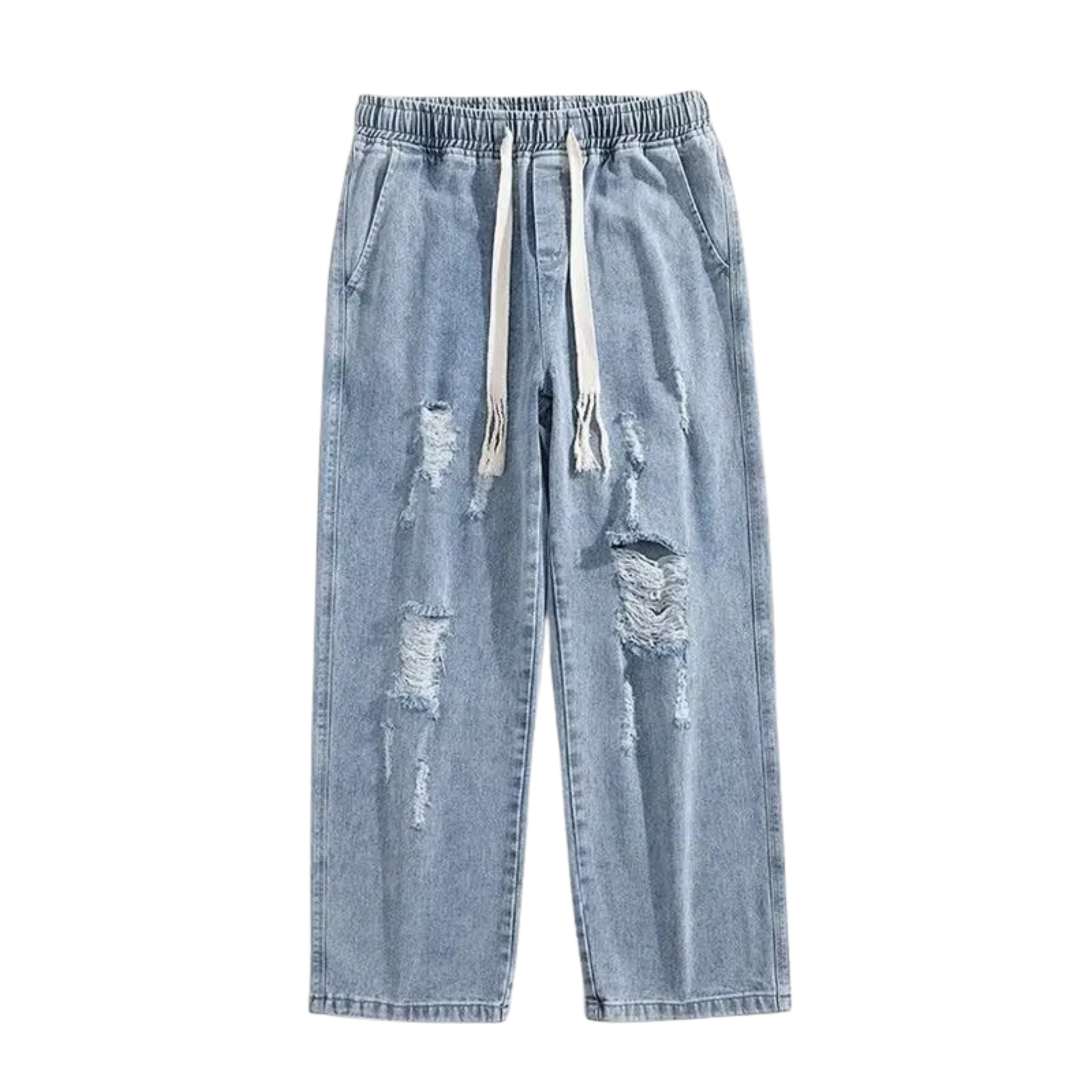- Features: Distressed detailing, elastic waistband with drawstring, reinforced seams