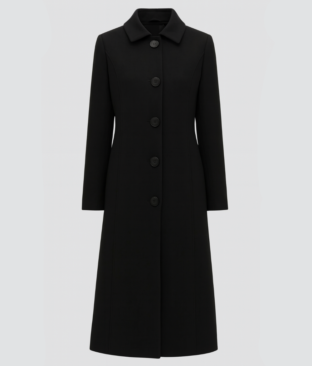 The knee-length cut provides a balanced shape that feels tailored yet easy to layer, offering warmth and structure without bulk.